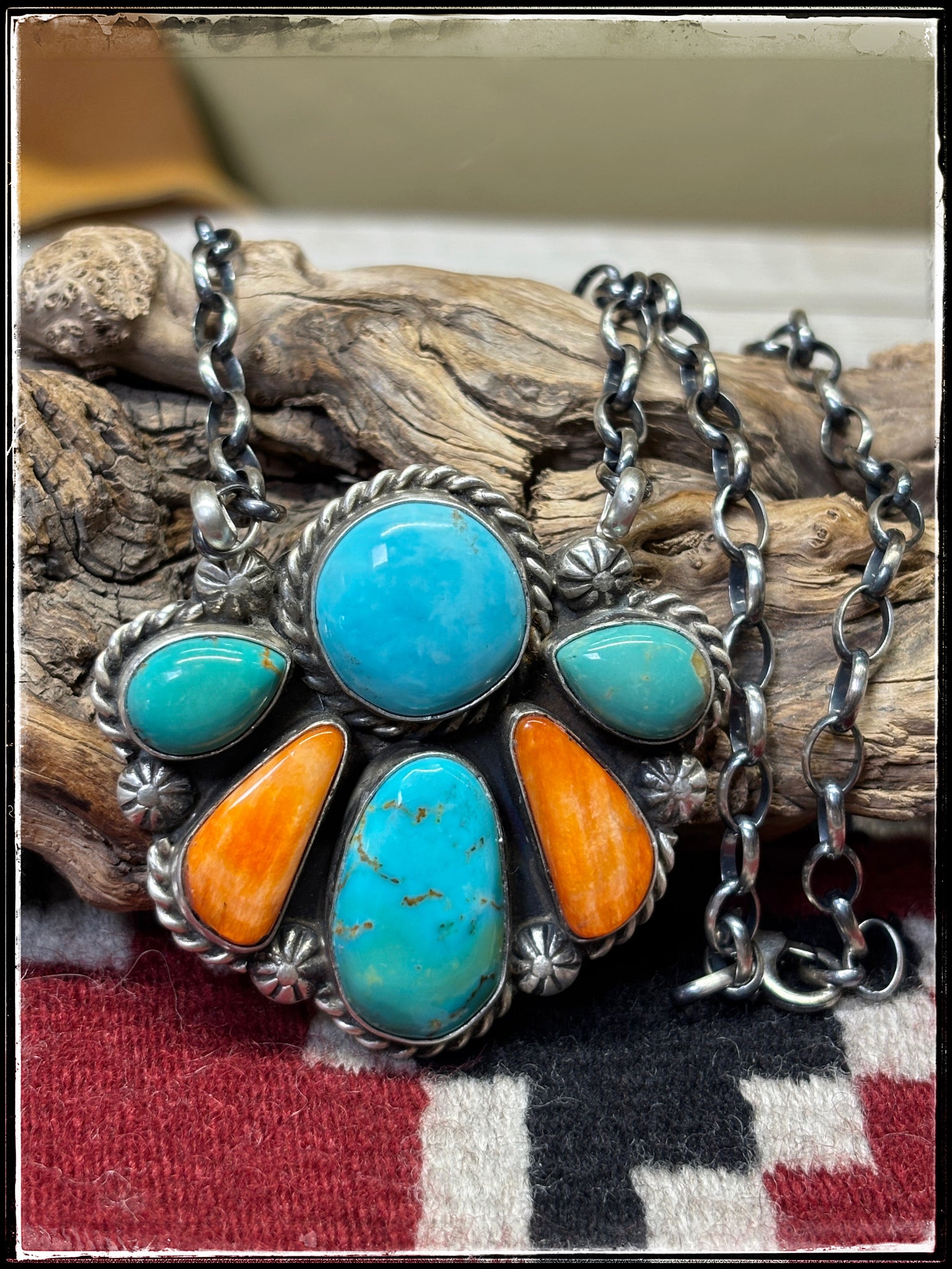 A beautiful combination of orange spiny shell and blue green Kingman turquoise stones, stet in a half cluster design of sterling silver from Navajo silversmith Augustine Largo.